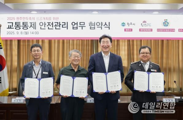 데일리연합 (SNSJTV) 이기삼 기자 | 원주시는 오는 10월 24일부터 26일까지 열리는 ‘2025 원주만두축제’의 성공적인 개최를 위해 지난 8일 시청 7층 투자상담실에서 원주시자율방범연합대 및 (사)원주모범운전자회와 교통 통제·안전관리 협약을 체결했다.