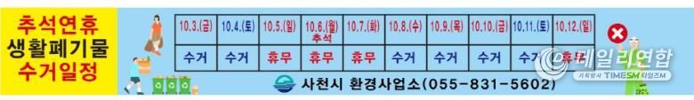데일리연합 (SNSJTV) 이동수 기자 | 사천시는 추석 명절을 맞아 9월 8일부터 10월 12일까지 ‘2025년 추석 폐기물 관리대책’을 수립·추진해 명절 쓰레기 대란을 사전에 막는다고 10일 밝혔다.