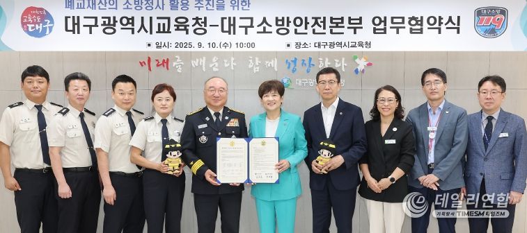 데일리연합 (SNSJTV) 김준 기자 | 대구시교육청은 대구소방안전본부와 9월 10일 오전 10시 시교육청 접견실에서 2025년 3월 1일 자로 폐교된 서변초 조야분교에 119특수구조대 청사 이전 추진을 위한 업무 협약을 체결했다.