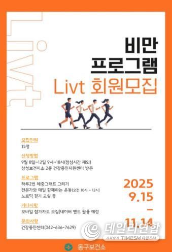 데일리연합 (SNSJTV) 임재현 기자 | 대전 동구는 이달 15일부터 11월 14일까지 2개월간 삼성보건지소 내 동구 힐링건강증진센터에서 ‘제3회 Livt 성인비만교실’ 프로그램을 운영한다고 밝혔다.