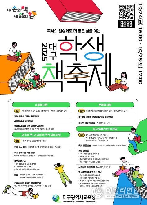 데일리연합 (SNSJTV) 김준 기자 | 대구시교육청은 독서인문교육 소통의 장을 마련하기 위해 10월 24일부터 25일까지 대구민주시민교육센터와 대구2․28기념학생도서관에서 ‘2025. 대구 학생 책축제’를 개최한다.