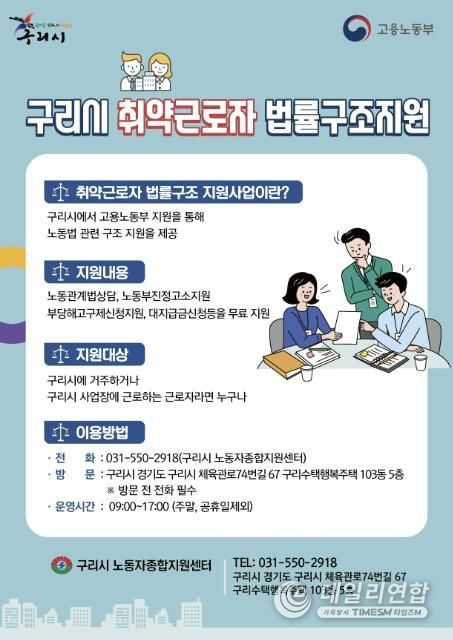 데일리연합 (SNSJTV) 김민제 기자 | 구리시는 최근 경기 불황으로 임금체불 문제가 사회적 이슈로 드러남에 따라 '2025년 노동 약자 일터 개선 사업'의 일환으로 노동 약자 법률구조 사업을 오는 9월 22일부터 확대 시행한다고 밝혔다.