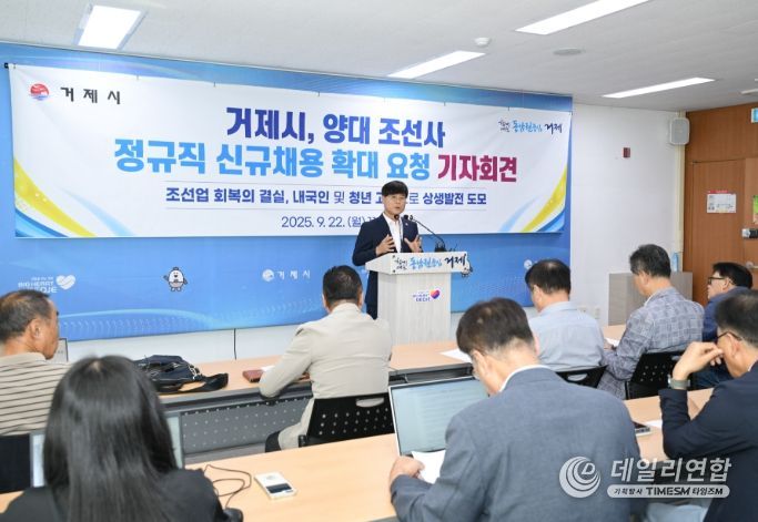 데일리연합 (SNSJTV) 임재현 기자 | 변광용 거제시장은 22일 기자회견을 열고, 조선업 정규직 신규채용 확대 및 지역 인재 육성 방안을 제안하며, 삼성중공업과 한화오션 등 양대 조선소의 적극적인 협력을 촉구했다.