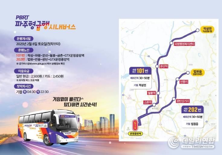 파주시가 내놓은 해법은 신도시와 구도심의 주요 거점을 연결하는 파주형 간선급행시내버스(PBRT, Paju Bus Rapid Transit)다. 올해 2월 개통한 파주형 간선급행시내버스는 적성‧문산 권역과 법원‧광탄 권역에서 신도시 내 지티엑스(GTX) 운정중앙역을 연계하는 두 개 노선으로, 3~5개 정류장만 경유해 이동시간을 30분 이내로 단축했다. 이 중 적성‧문산권 노선은 경의중앙선 3개 역(문산, 월롱, 금촌)에도 정차해 지티엑스(GTX) 뿐만 아니라 경의중앙선과의 접근성도 향상시켰다.