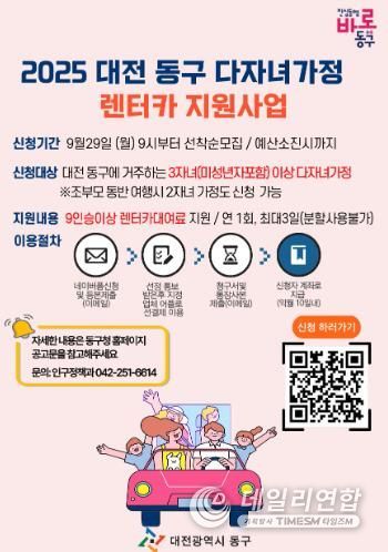 데일리연합 (SNSJTV) 김민제 기자 | 대전 동구는 다자녀 가정의 여가활동 지원과 아이 키우기 좋은 환경 조성을 위해 ‘2025년 다자녀 가정 렌터카 지원사업’을 본격 추진, 이달 29일부터 참여자를 모집한다고 밝혔다.