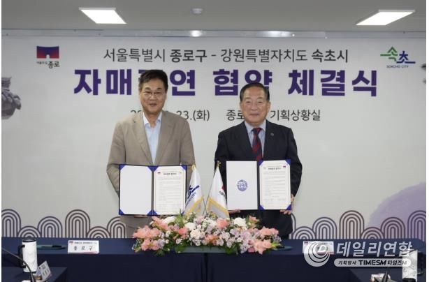 데일리연합 (SNSJTV) 김민제 기자 | 종로구는 9월 23일 구청 기획상황실에서 속초시와 자매결연을 맺었다. 이로써 두 도시는 교육·문화·관광을 비롯해 재난 대응까지 다양한 분야에서 교류와 협력을 강화할 방침이다.
