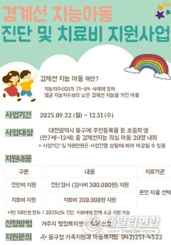 데일리연합 (SNSJTV) 김민제 기자 | 대전 동구는 경계선지능아동(느린학습자)이 건강한 사회구성원으로 성장하고 자립할 수 있도록, 고향사랑기금을 활용한 ‘경계선지능아동 검사 및 치료비 지원사업’을 본격 추진한다고 24일 밝혔다.