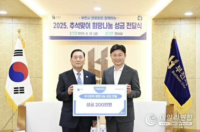 데일리연합 (SNSJTV) 김민제 기자 | 부천시는 지난 19일 부천시청 만남실에서 부천시 원로회가 추석을 앞두고 희망나눔 성금 200만 원을 전달했다고 밝혔다. 전달식에는 조용익 부천시장이 참석해 지역사회 나눔에 앞장서는 원로회에 감사의 뜻을 표했다.