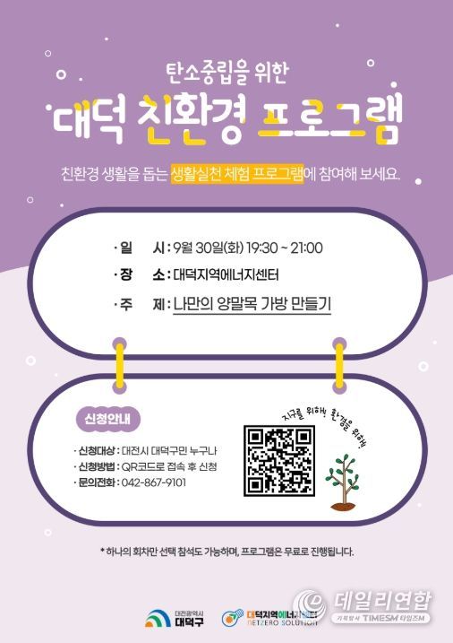 데일리연합 (SNSJTV) 임재현 기자 | 대전 대덕구는 구민이 일상에서 친환경 실천을 경험할 수 있도록 ‘대덕 친환경 프로그램’을 오는 11월까지 매월 운영한다고 밝혔다.