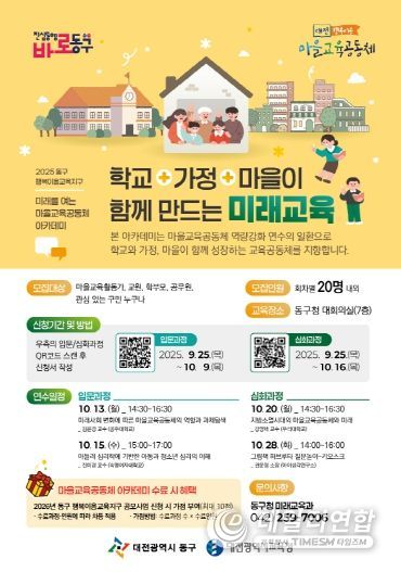 데일리연합 (SNSJTV) 김민제 기자 | 대전 동구는 학생들의 행복한 성장을 지원하기 위해 학교와 가정, 지역사회가 하나 돼 협력하는 ‘미래를 여는 마을교육공동체 아카데미’를 개최한다고 25일 밝혔다.