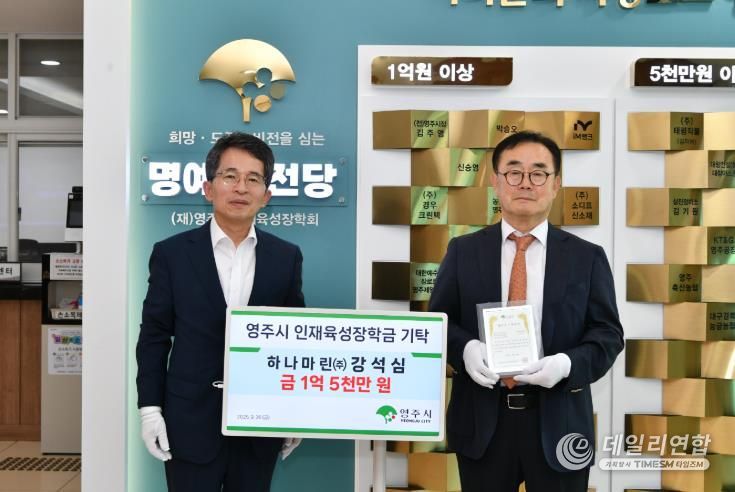 데일리연합 (SNSJTV) 김민제 기자 | (재)영주시인재육성장학회는 지난 26일, 하나마린㈜ 강석심 회장이 영주 지역 인재를 위한 장학금 1억 5천만 원을 기탁했다고 밝혔다.
