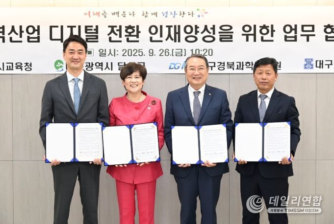 데일리연합 (SNSJTV) 김준 기자 | 대구 달성군은 9월 26일 대구시교육청에서 대구시교육청, 대구경북과학기술원, 대구공업고등학교와 함께 지역산업 디지털 전환 인재양성 선도사업 운영을 위한 4자 업무협약을 체결했다고 밝혔다.