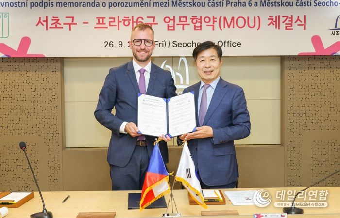 데일리연합 (SNSJTV) 김민제 기자 | 서울 서초구는 지난 26일 구청 5층 대회의실에서 체코 프라하 6구와 문화, 예술, 교육 분야 등 상호 교류 우호증진을 위한 우호도시협정 양해각서(MOU)를 체결했다고 밝혔다.
