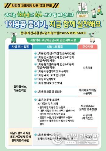 데일리연합 (SNSJTV) 김민제 기자 | 사천시는 9월 30일부터 10월 31일까지 6주간 관내 1회용품 사용규제 대상 사업장에 대한 집중 점검을 실시한다고 밝혔다.