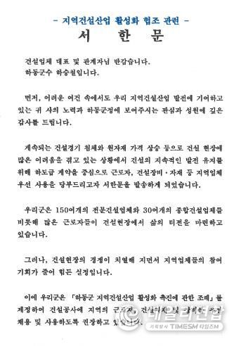 하승철 하동군수는 서한문을 통해 “지역 건설의 지속적인 발전 유지를 위해 하도급 계약을 중심으로 근로자, 건설장비·자재 등 지역업체를 우선 사용해 달라”고 요청했다.