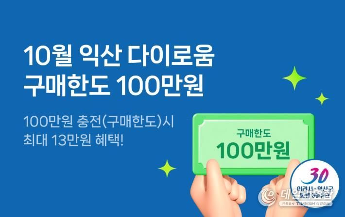 데일리연합 (SNSJTV) 김민제 기자 | 익산시가 이리시·익산군 통합 30주년과 시민의 날(10월 3일)을 기념해, 10월 한 달간 지역사랑상품권 '익산 다이로움'의 개인별 구매한도를 기존 60만 원에서 100만 원으로 확대한다고 30일 밝혔다.