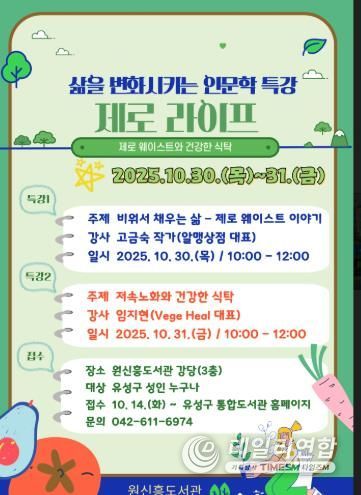 데일리연합 (SNSJTV) 김민제 기자 | 대전 유성구는 10월 30일과 31일 이틀간 원신흥도서관에서 ‘삶을 변화시키는 인문학 특강: 제로 라이프’를 운영한다.