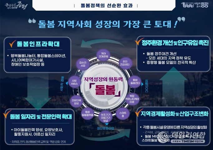 이재영 군수는 “돌봄은 복지를 넘어 일자리와 산업을 창출하고, 지역 경제와 공동체를 성장시키는 힘”이라며 “증평형 돌봄이 대한민국의 새로운 표준이 되도록 모든 역량을 집중하겠다”고 밝혔다.