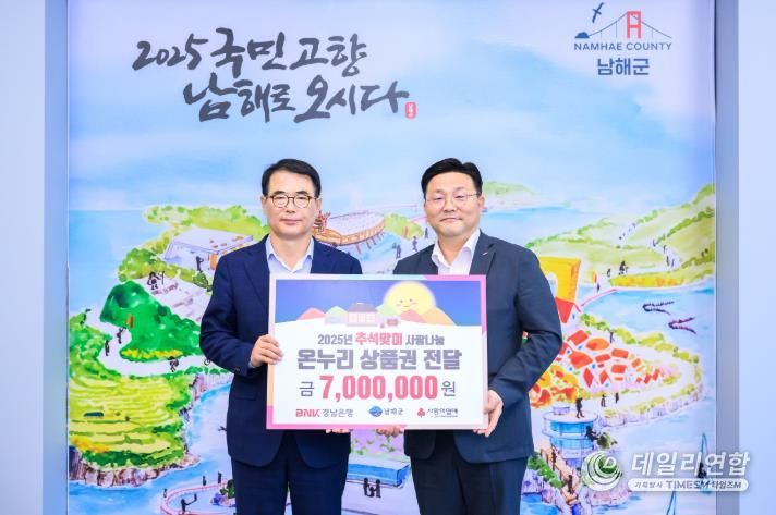 데일리연합 (SNSJTV) 김민제 기자 | 남해군은 지난 30일 BNK경남은행 남해지점이 추석 명절을 앞두고 700만원 상당의 온누리상품권을 기탁했다고 밝혔다.