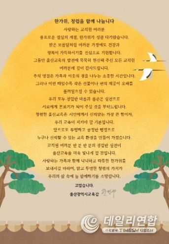 데일리연합 (SNSJTV) 김준 기자 | 울산광역시교육청은 추석을 앞두고 1일 울산 지역 전 교육기관과 학교 교직원들에게 청렴 의지를 다지는‘청렴 서한문’을 보냈다.