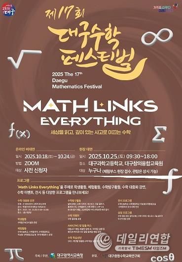데일리연합 (SNSJTV) 김준 기자 | 대구시교육청이 주최하고 대구중등수학교육연구회가 운영하는 ‘제17회 대구수학페스티벌’이 10월 25일 9시 30분부터 대구과학고 및 대구창의융합교육원에서 'Math Links Everything(수학은 모든 것을 연결한다)'이라는 주제로 개최된다.