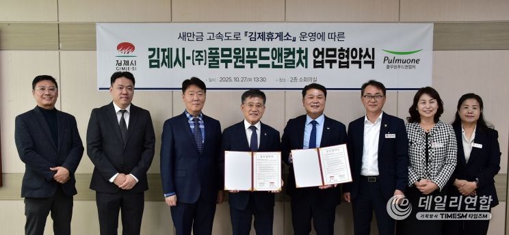 데일리연합 (SNSJTV) 임재현 기자 | 김제시는 27일 ㈜풀무원푸드앤컬처와 '새만금전주간' 고속도로 개통에 따라 새롭게 조성되는‘김제휴게소’운영에 따른 업무협약을 체결했다고 밝혔다.