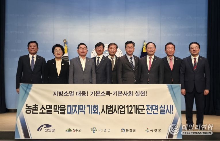 데일리연합 (SNSJTV) 김민제 기자 | 진안군, 장수군, 곡성군, 봉화군, 옥천군은 10월 29일 국회에서 농어촌 기본소득 시범사업 1차 심사를 통과한 12개 군 전면 시행을 촉구하는 공동성명을 발표했다.