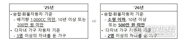 2026년부터는 소형 이하이면서 10년 이상 또는 500만 원 미만인 승합·화물차도 일반재산 환산율이 적용되고, 2명 이상의 자녀가 있으면 다자녀 가구로 인정된다.