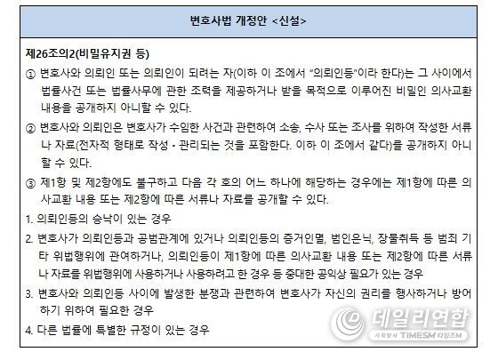 개정안은 ‘변호사와 의뢰인이 주고받은 법률상담 내용’이나, ‘변호사가 작성한 의견서’ 등을 비밀유지권으로 보호하고, ‘의뢰인이 공개에 동의한 경우’, ‘범죄와 관련되어 있는 경우’ 등 비밀유지권이 인정되지 않는 예외 사유를 규정하는 것을 주요 내용으로 한다.