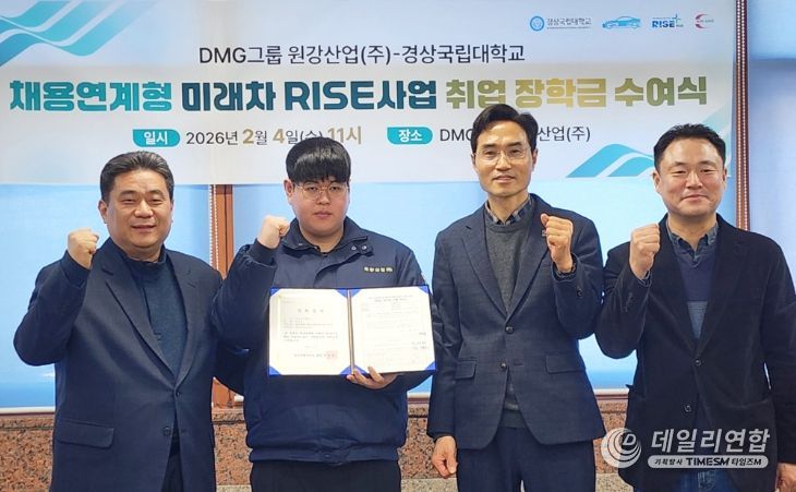 데일리연합 (SNSJTV) 김민제 기자 | 경상국립대학교는 2월 4일 오전 11시 함안군에 소재한 원강산업(주) 회의실에서 ‘채용연계형 미래차 RISE사업 취업 장학금 수여식’을 개최했다.