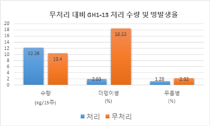 무처리 대비 GH1-13처리로 무름병은 1.1%가 억제됐고, 더뎅이병은 16.5%를 억제, 수량은 1.18배가 증가하는 효과를 확인했다. 완주군 이서면 용서리 농가포장에서도 수량이 1.2배 증가했다.