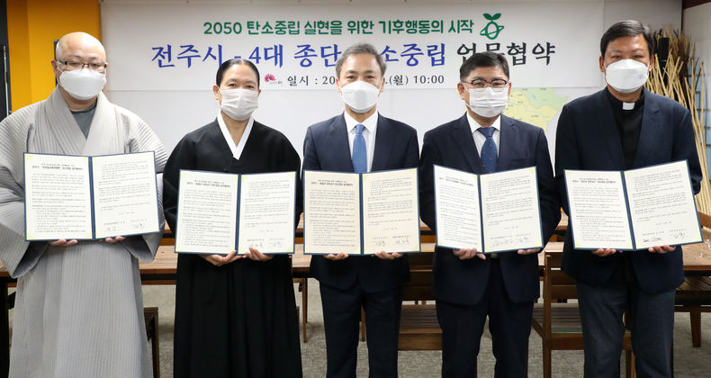 시는 8일 시장실에서 김승수 전주시장과 추이엽 전주시기독교총연합회장, 우림 대한불교조계종 제17교구 본사 금산사 사회국장, 김희태 천주교 전주교구 총대리, 한은숙 원불교 전북교구장 등 주요 4대 종단 관계자들이 참석한 가운데 탄소중립 실현을 위한 업무협약을 체결했다.