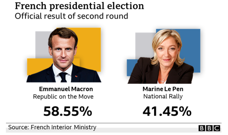 엘라브는 마크롱 대통령이 57.6%, 르펜 후보가 42.4%를 득표한다고 예측했고, 입소스와 소프라 스테리아는 마크롱 대통령이 58.2%, 르펜 후보가 41.8%의 득표율을 기록한다고 예상했다.
