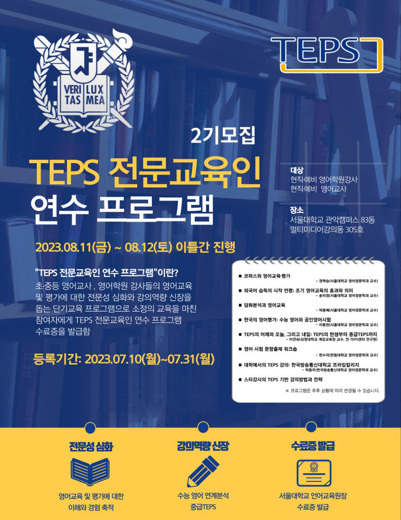 이번 연수 프로그램은 8월 11일과 8월 12일 이틀간 진행되며, 서울대학교 언어교육원장 명의의 ‘TEPS 전문교육인 연수 프로그램’ 수료증이 발급된다.