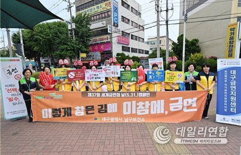 데일리연합 (아이타임즈M 월간한국뉴스신문) 김희빈 기자 | 대구 남구보건소는 '제37회 세계 금연의 날(5.31.)'을 맞이하여 ”이렇게 참은 김에, 이참에 금연“ 슬로건을 토대로 관내 주민 대상 금연 실천을 유도하기 위해 지난 30일, 안지랑 네거리 및 횡단 보도 등에서 금연 홍보 캠페인을 펼쳤다.