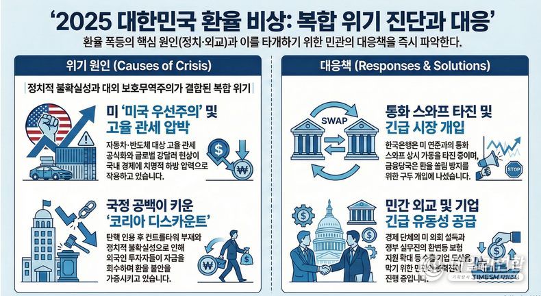 국제 정세와 국내 경제 흐름을 심층 분석한 결과 현재의 환율 폭등은 트럼프 행정부의 '미국 우선주의'가 전 세계 경제 질서를 뒤흔들고 있는 데서 비롯된 것으로 파악됐다. 특히 미 백악관이 한국을 포함한 주요 무역 흑자국들을 향해 자동차와 반도체 분야에 대한 고율 관세 부과 카드를 공식화하면서 탄핵 정국으로 인해 외교적 협상력이 약화된 한국 정부를 상대로 유리한 고지를 점하려는 전략적 공세가 노골화되고 있다고 분석했다.