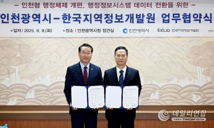 데일리연합 (SNSJTV) 김민제 기자 | 인천광역시는 9월 9일 시청 접견실에서 한국지역정보개발원 상호기관 간 업무협약을 체결했다고 밝혔다.