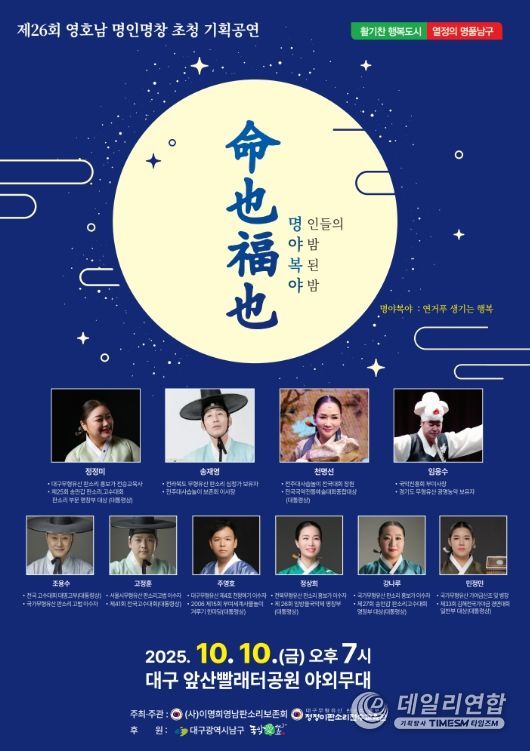 데일리연합 (SNSJTV) 김민제 기자 | 대구 남구는 이번 추석 연휴 기간인 10월 10일 오후 7시 남구 앞산빨래터공원 야외무대에서 (사)이명희영남판소리보존회 주최로 제26회 영호남 명인명창 초청 기획공연 '명야복야(命也福也)'를 개최한다고 밝혔다.