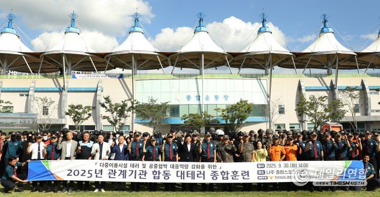 데일리연합 (SNSJTV) 김준 기자 | 전남경찰청은 나주종합스포츠파크에서 국가정보원(광주지부), 육군 제31보병사단, 제11공수특전여단, 공군 제1전투비행단, 전남소방본부, 영산강유역환경청 등 10개 기관 250여명이 참여한 가운데 관계기관 합동 대테러 종합훈련을 실시했다.