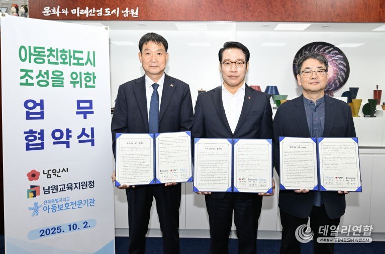데일리연합 (SNSJTV) 김민제 기자 | 남원시는 지난 2일 남원교육지원청, 전북동부아동보호전문기관과 함께 아동친화도시 조성 및 아동 권리 증진을 위한 업무협약식을 체결했다.