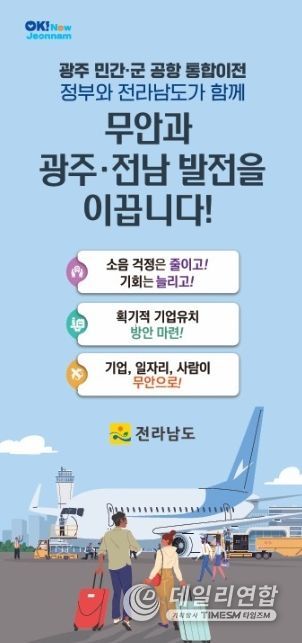 데일리연합 (SNSJTV) 김민제 기자 | 전라남도는 전남·광주·무안의 상생과 도민의 오랜 염원을 이루기 위해 광주 민간·군 공항의 무안국제공항 통합이전을 ‘더 이상 미룰 수 없는 시대적 과제’로 규정하고 강력히 추진할 계획이라고 밝혔다.