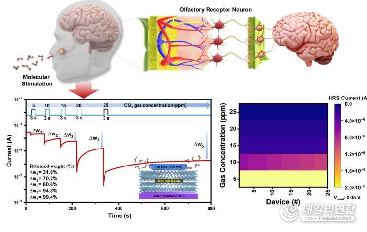 경상국립대학교 박준홍 교수 연구팀은 인간의 후각까지 모방하기 위해 반데르발스 소재인 산화 맥신(Mxene)을 활용하여, 분자의 흡착·탈착에 따른 소자 저항 특성의 준-가역적 제어와 분자 농도에 대해 다진법 연산이 가능한 ‘케미멤리스터’를 제시했다.