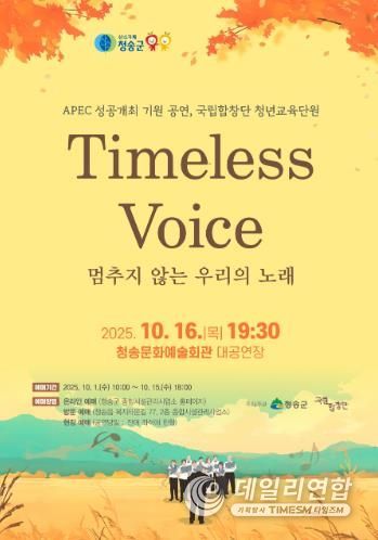 데일리연합 (SNSJTV) 박해리 기자 | 청송군은 오는 16일 저녁 7시 30분, 청송문화예술회관 대공연장에서 APEC 성공개최를 기원하는 국립합창단 청년교육단원 공연 ‘Timeless Voice – 멈추지 않는 우리의 노래’를 개최한다.