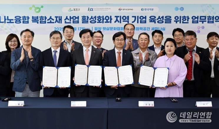 데일리연합 (SNSJTV) 김민제 기자 | 경남 밀양시는 17일 햇살문화캠퍼스 소통협력공간 세미나실에서 한국건설생활환경시험연구원, (주)스페이스프로, (주)한국카본과 나노융합 복합소재 산업 활성화 및 지역기업 육성을 위한 업무협약을 체결했다고 밝혔다.