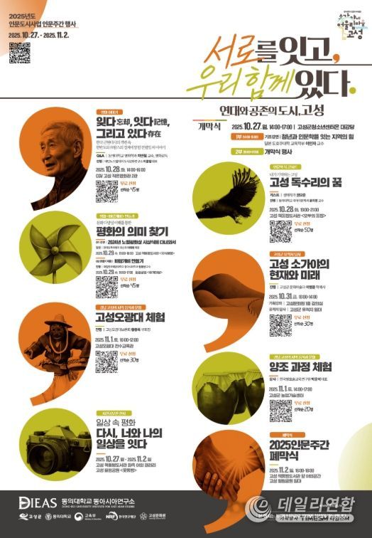 데일리연합 (SNSJTV) 김민제 기자 | 고성군은 동의대학교와 협력하여 수행하는 사업인 ‘2025년도 인문도시사업 인문주간 행사’를 10월 27일 청소년센터 온에서 개막식을 시작으로 11월 2일까지 7일간 개최한다.