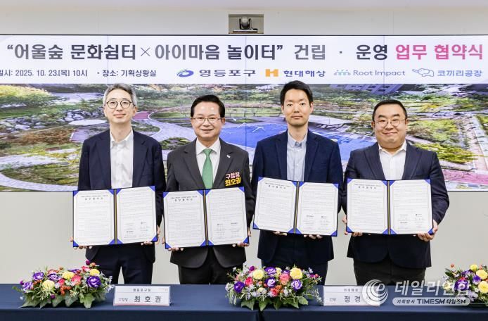 데일리연합 (SNSJTV) 김민제 기자 | 영등포구가 10월 23일 현대해상, 루트임팩트, 코끼리공장과 함께 ‘어울숲 문화쉼터×아이마음 놀이터’ 건립과 운영을 위한 다자간 업무협약을 체결했다고 밝혔다.