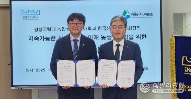 데일리연합 (SNSJTV) 김민제 기자 | 경상국립대학교 농업생명과학대학과 한국산지보전협회는 10월 28일 농업생명과학대학 학장실에서 산지분야 공동 기술연구 및 맞춤형 교육훈련을 통해 전문인력을 양성하는 업무협약을 체결했다.