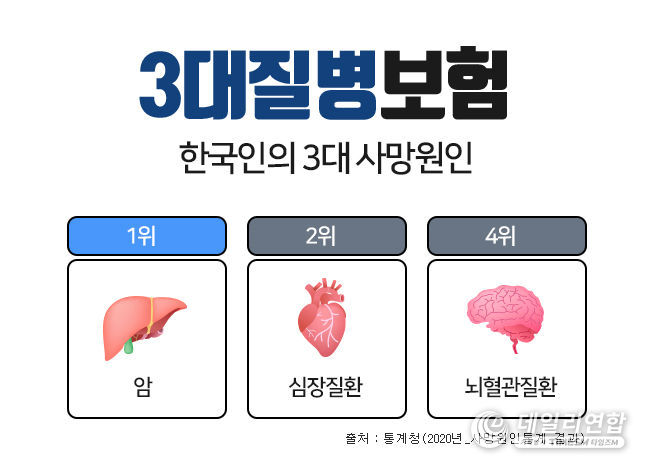 데일리연합 (SNSJTV) 임재현 기자 | 흔히 3대질병이라 일컫는 암, 심혈관질환, 뇌혈관질환은 통계청 발표자료에 따르면 한국인의 주요 사망원인 중에서 3위 폐렴을 제외하고 1~4위를 차지하고 있으며, 이전부터 지금까지도 살면서 가장 먼저 대비해야 하는 치명적인 질병으로 강조되고 있다. 이러한 중대질병에 대비하기 위하여 상기 세가지 치명적인 질병을 집중보장하는 3대질병진단비보험을 많이 가입하고 있다. 3대진단비보험은 각각의 질병을 중점적으로 보장하면서도 가입자 특성에 맞는 특약을 추가함으로써 종합건강보험으로도 활용할 수가 있다.