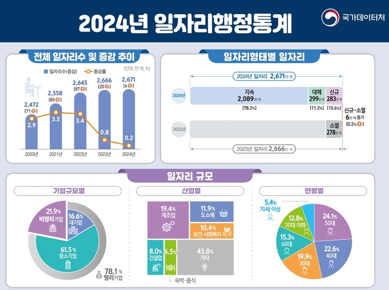 국가데이터처(전 통계청)가 11일 발표한 '2024년 일자리행정통계 결과'를 보면 지난해 연간 일자리는 2천671만개로 전년에 비해 6만개(0.2%) 증가하는 데 그쳤다.