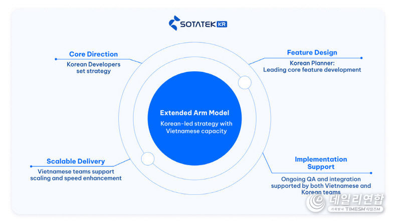 데일리연합 (SNSJTV) 임재현 기자 | 한국에서 IT 인력 부족 현상이 지속되는 가운데, 베트남 개발자를 국내 개발팀의 '확장된 팔(extended arm)'로 활용하는 모델이 한국 SI 기업과 기술기업에게 중요한 전략적 해법으로 떠오르고 있다. 다만 이 모델이 효과적으로 운영되기 위해서는 각 팀의 역할을 명확히 구분하고, 빠르게 변하는 한국 시장의 특성에 맞게 적응하는 것이 필수적이다. SotaTek Korea는 오랜 경험과 한국 업무 문화에 맞춘 조직 구조 덕분에 이 결합 모델을 성공적으로 구현한 몇 안 되는 베트남 기업 중 하나로 평가된다.